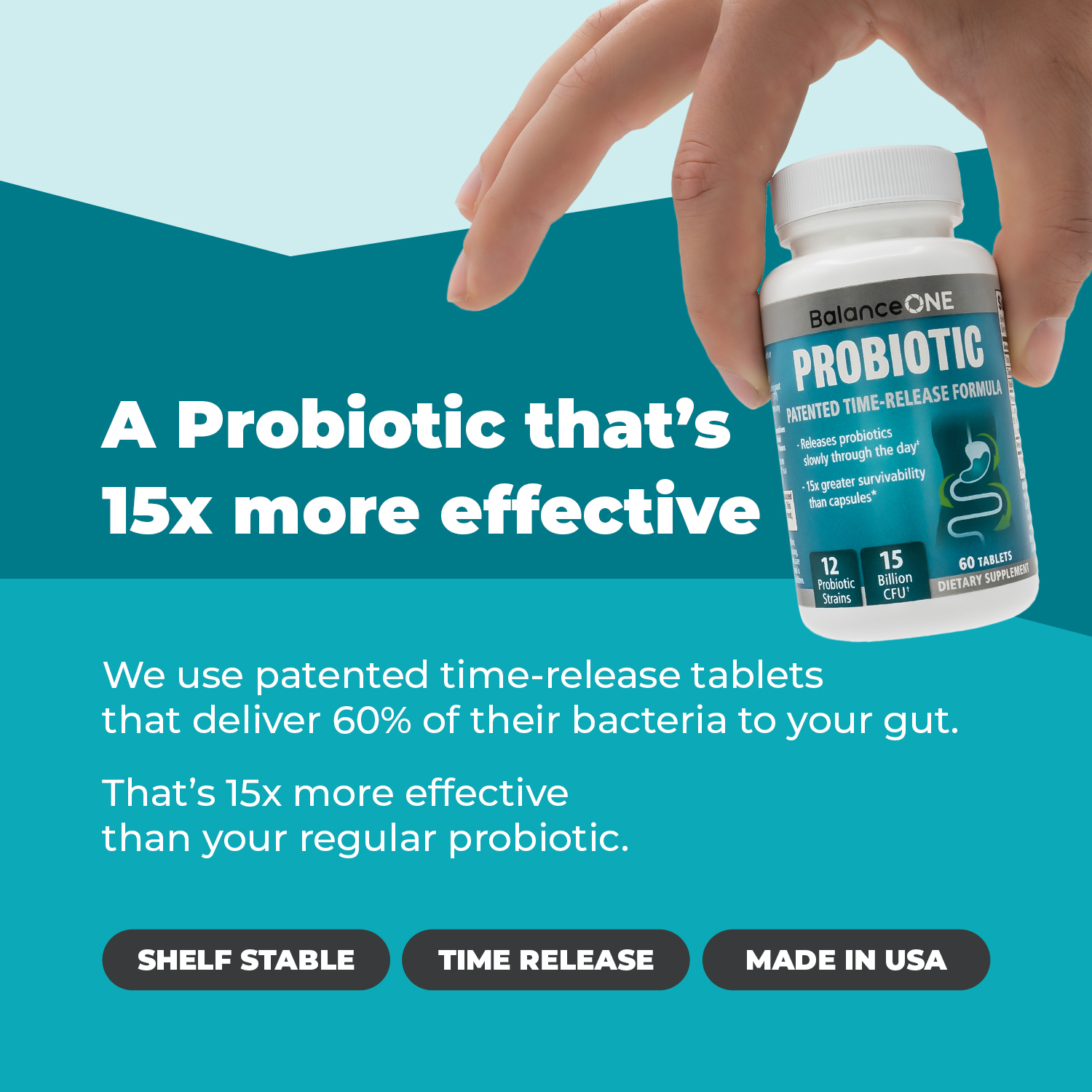 Our time-release probiotic delivers 15 billion CFUs of 12 carefully chosen strains. The patented delivery system protects the probiotics from stomach acid, getting up to 15 times more bacteria to your gut than regular capsules.